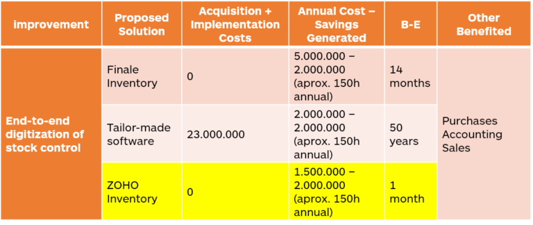 - Cost of each possible technological solution (start-up, annual operating cost with licenses, maintenance, etc.).